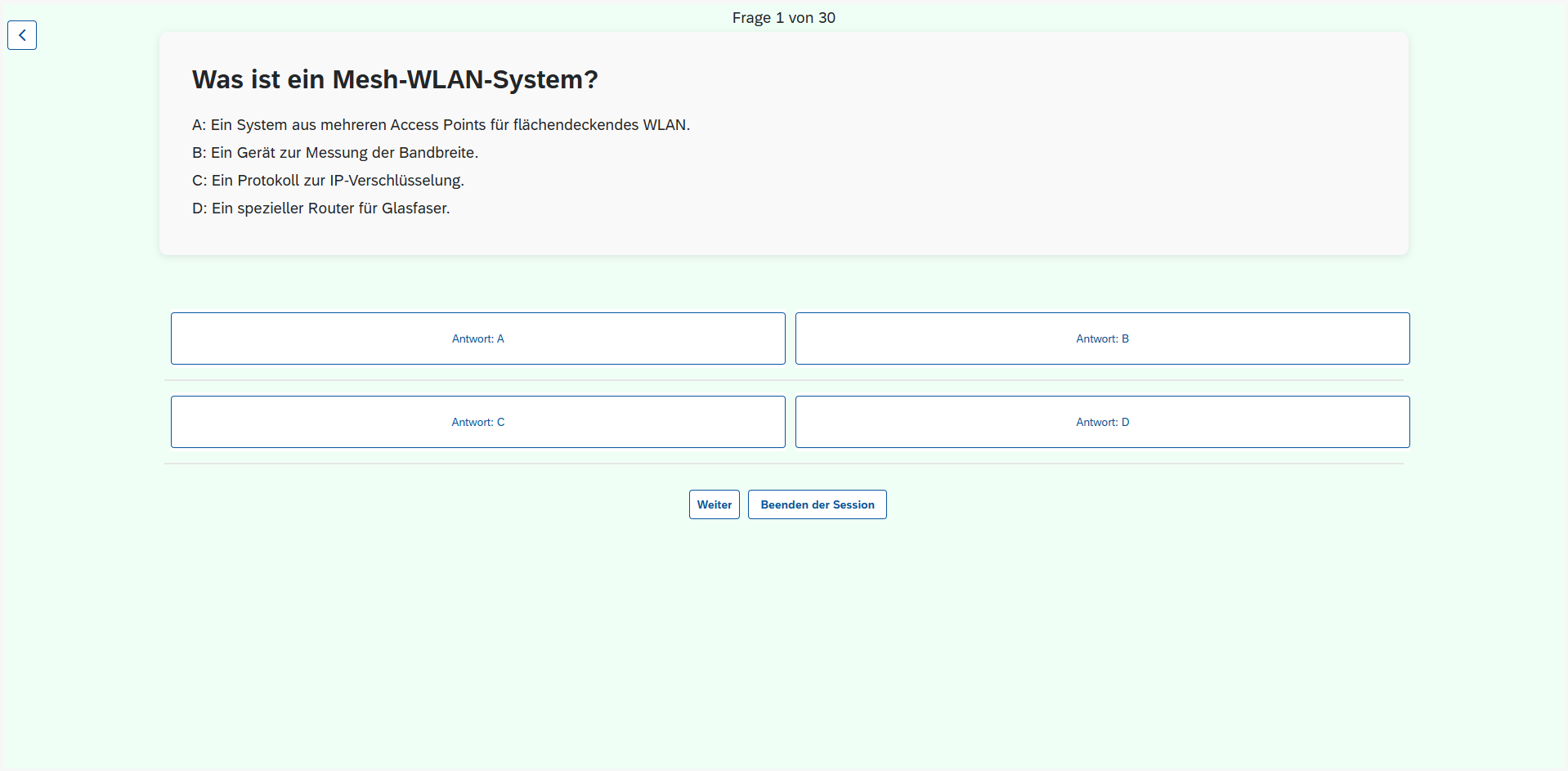 Im IT Quiz Coach können Schüler verschiedene IT Themen auswählen und dazu passende Fragen beantworten. Die Fragen werden zentral in der Datenbank hinterlegt und stehen den Schülern anschließend direkt im Quiz zur Verfügung. Nach Abschluss eines Quiz erhalten die Schüler eine Auswertung, in der ersichtlich ist, welche Fragen richtig oder falsch beantwortet wurden. Zusätzlich können sie ihre bisherigen Ergebnisse als persönliche Statistik einsehen, um ihren Lernfortschritt besser einschätzen zu können. Lehrkräfte haben die Möglichkeit, die Gesamtergebnisse der Schüler einzusehen und dadurch zu erkennen, welche Themenbereiche im Unterricht gegebenenfalls wiederholt oder vertieft werden sollten.