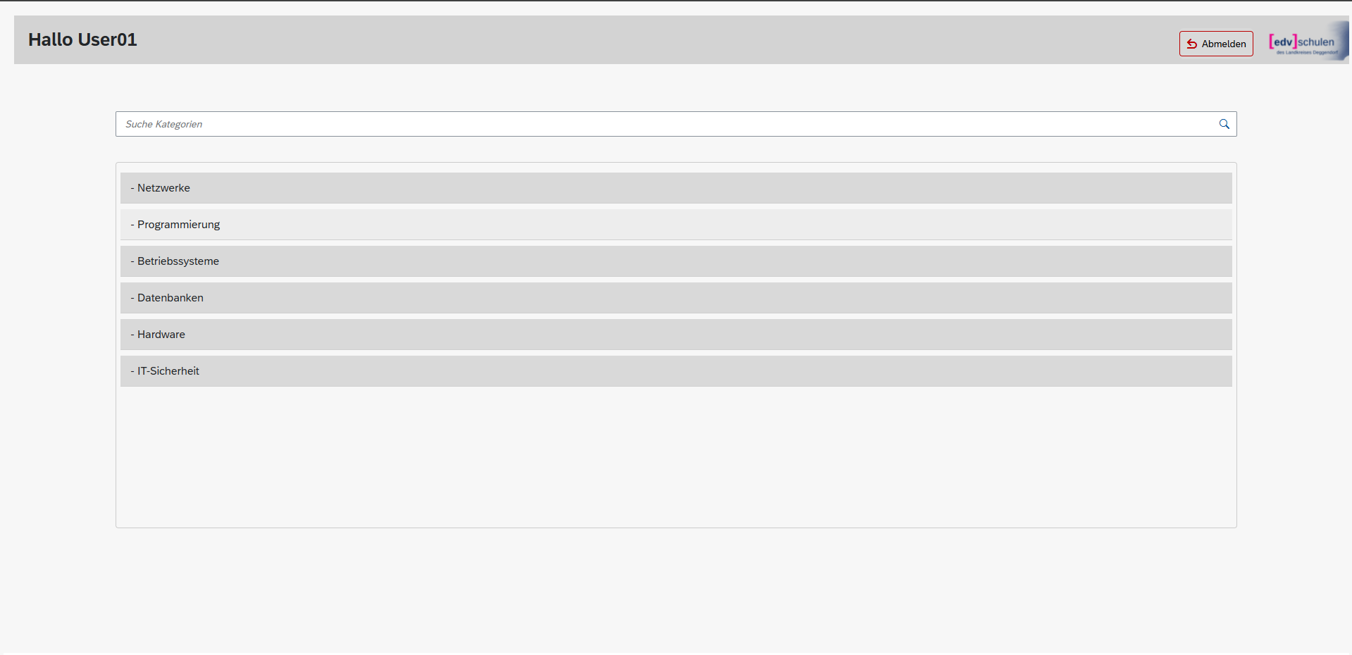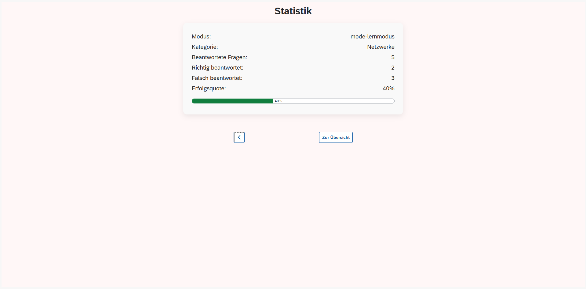 Im IT Quiz Coach können Schüler verschiedene IT Themen auswählen und dazu passende Fragen beantworten. Die Fragen werden zentral in der Datenbank hinterlegt und stehen den Schülern anschließend direkt im Quiz zur Verfügung. Nach Abschluss eines Quiz erhalten die Schüler eine Auswertung, in der ersichtlich ist, welche Fragen richtig oder falsch beantwortet wurden. Zusätzlich können sie ihre bisherigen Ergebnisse als persönliche Statistik einsehen, um ihren Lernfortschritt besser einschätzen zu können. Lehrkräfte haben die Möglichkeit, die Gesamtergebnisse der Schüler einzusehen und dadurch zu erkennen, welche Themenbereiche im Unterricht gegebenenfalls wiederholt oder vertieft werden sollten.