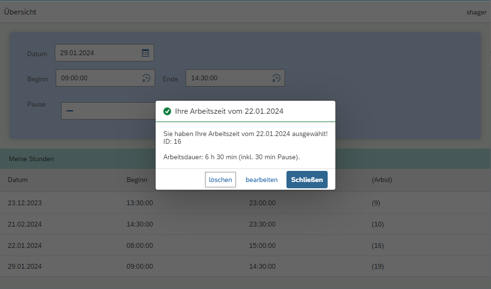 Es soll eine übersichtliche Webseite entstehen, auf denen die Mitarbeiter ihre Daten zur Zeiterfassung einfach und schnell eintragen und auch bearbeiten können. Die Daten werden über ein Formular eingegeben und per OData-Webservice in einer HANA-Datenbank abgespeichert.