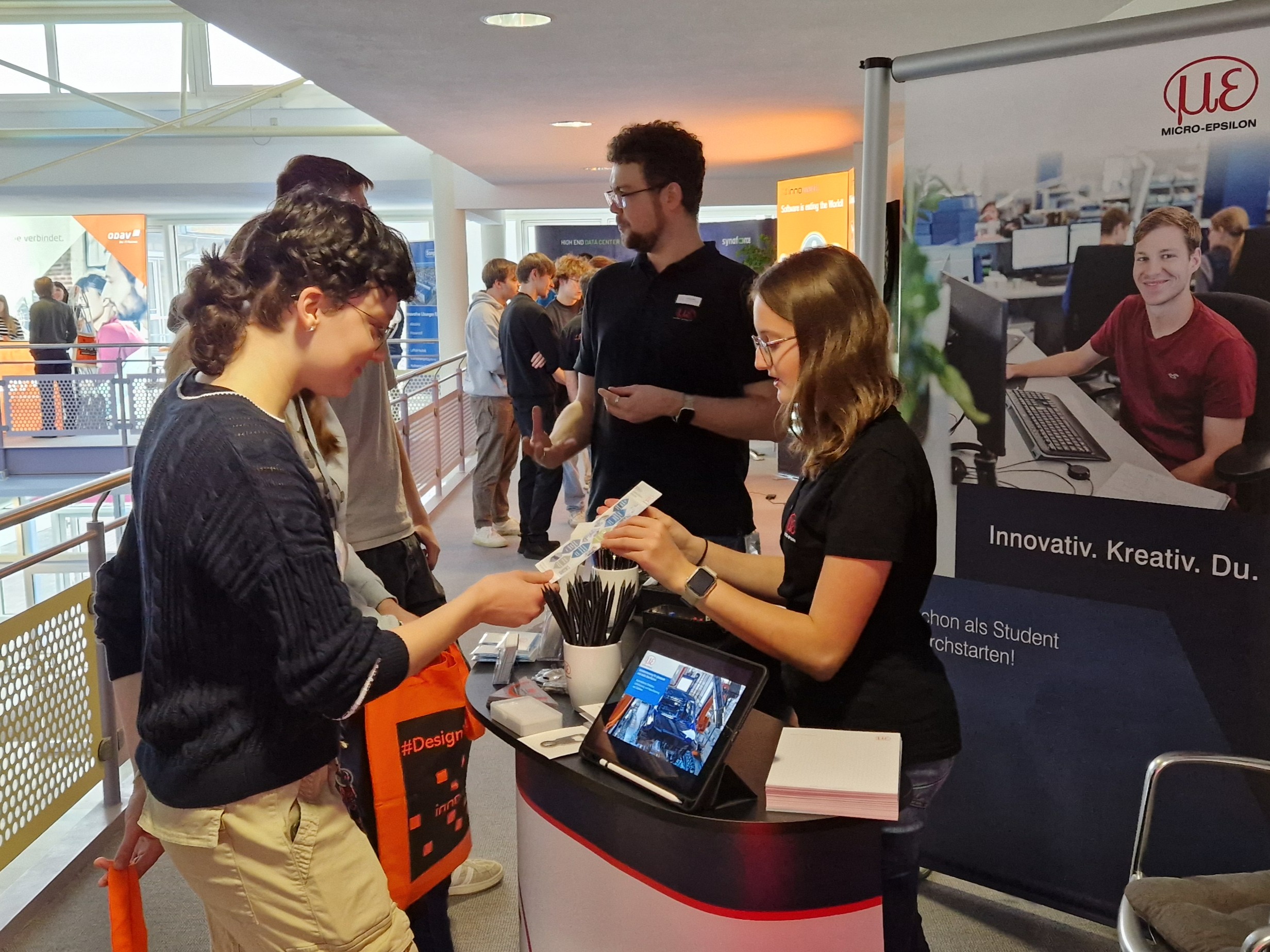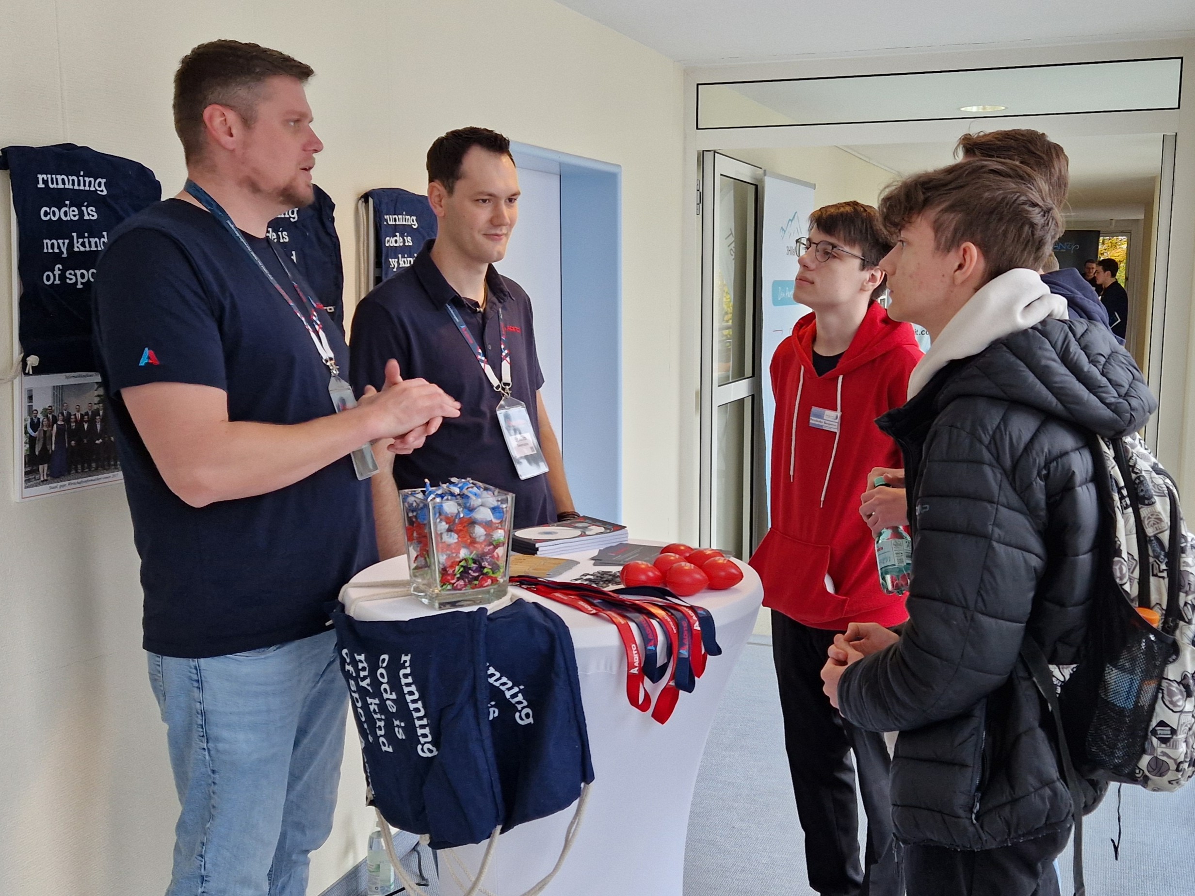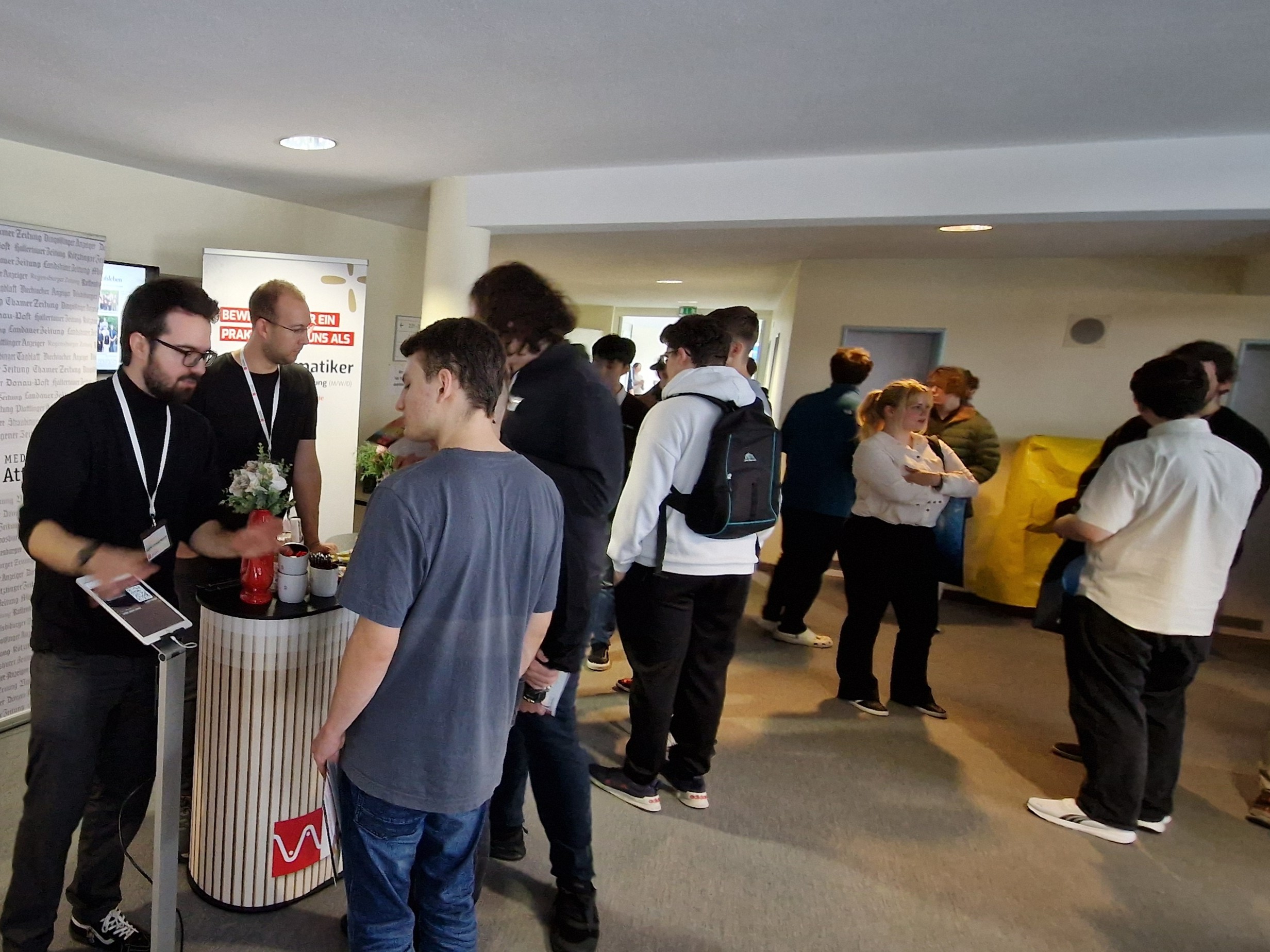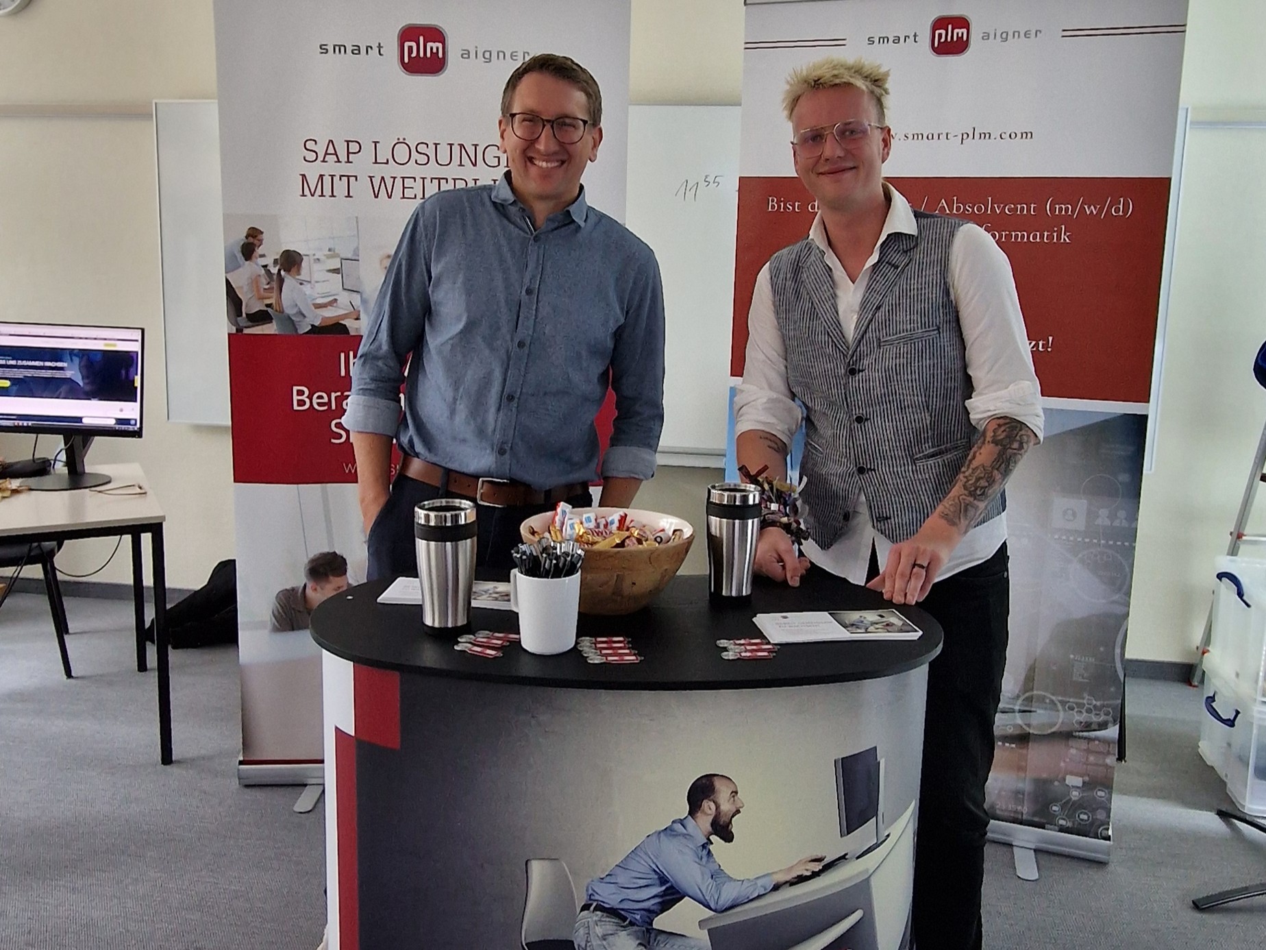 Die Unternehmen waren ebenfalls vom Tag sehr angetan und unter den Firmenvertretern befanden sich viele Ehemalige, die in neuer Rolle an ihre Schule zurückgekehrt waren, um vom Arbeitsalltag zu berichten und potentielle Mitarbeiter anzuwerben: „Ich freue mich sehr hier zu sein“, erzählte Simon Frank von smart-plm Aigner. „Man ist ja selber mal auf der Schülerseite gestanden und daher kann man sich gut in das Gegenüber hineinversetzen, z.B. auch in innere Interessenskonflikte, welche Firma am besten zu einem passt, aber da kann ich heute viel Hilfreiches berichten.“